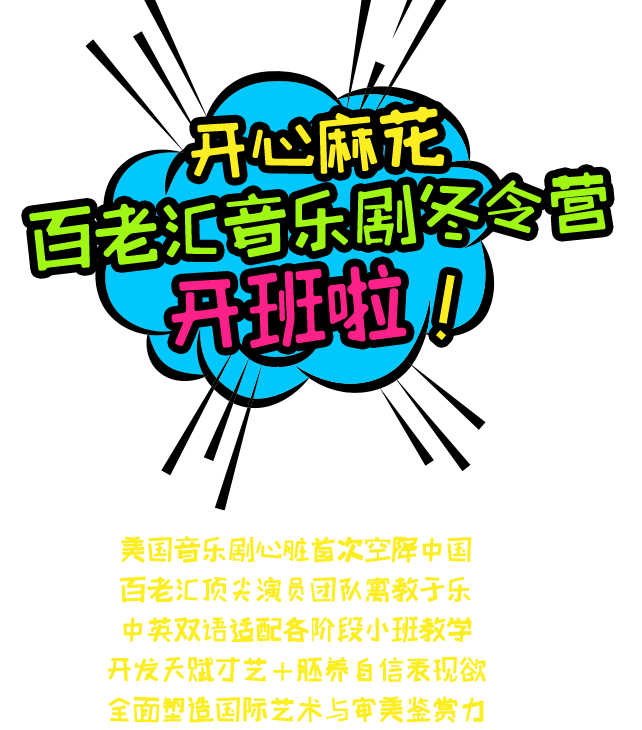 2017年1月21日-26日,开心麻花即将携手澳大利亚顶尖导师团队,面向3-5岁、6-8岁以及9-12岁的孩子开启一场为期一周的百老汇音乐剧体验之旅。本次冬令营,孩子们将跟随顶级少儿戏剧教育专家们度过欢乐多彩的团体生活,纯正的中英文愉快的沟通氛围,让孩子们快速提升英语口语,同时学习到包括《Let it go》等在内的多首百老汇音乐剧片段,以及专家特别为此编写的原创作品。麻花希望孩子们吸收最棒的音乐剧文化,率先建立高雅艺术认知鉴赏体系。他们在此不仅能收获友谊,更能在学习的过程中培养出综合才艺和坚定的自信心。
